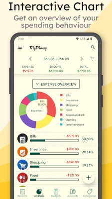 MyMoney வழங்கும் விரிவான பகுப்பாய்வு மூலம் உங்கள் செலவுப் பழக்கவழக்கங்களை எளிதில் புரிந்துகொள்ளலாம். வருமானம்-செலவு பை விளக்கப்படம், பணப் புழக்க விளக்கப்படம், மற்றும் கணக்கு பங்களிப்பு விளக்கப்படம் போன்ற தெளிவான வரைபடங்கள் உங்கள் நிதி நிலையைத் துல்லியமாகக் காட்டும். மேலும், MyMoney இன் விரைவான முகப்புத் திரை விட்ஜெட் உங்கள் இருப்பை உடனடியாகக் காணவும், பயணத்தின்போதே பதிவுகளைச் சேர்க்கவும் உதவுகிறது. இணைய இணைப்பு இல்லாமலேயே செயல்படும் வசதி, உள்ளூர் காப்புப் பிரதிகள் மூலம் உங்கள் தரவைப் பாதுகாக்கும் அம்சம், மற்றும் அச்சிடக்கூடிய விரிதாள் ஏற்றுமதி போன்ற சிறப்பு அம்சங்கள் MyMoney ஐ உங்கள் நம்பகமான நிதி மேலாளராக்கும்.