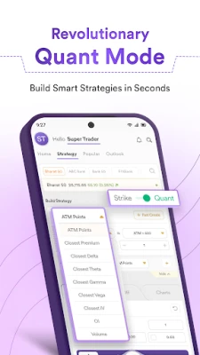 Options Trader வழங்கும் குவாண்ட் மோட் (Quant Mode), பல நிலைகளைக் கொண்ட ஆப்ஷன்ஸ் உத்திகளை உருவாக்கும் விதத்தையே மாற்றியமைக்கிறது. நீங்கள் ஒவ்வொரு ஒப்பந்தத்தையும் கைமுறையாகத் தேர்வு செய்வதற்குப் பதிலாக, ஒவ்வொரு நிலைக்கும் உங்களின் லாஜிக்கை வரையறுக்கலாம். இந்தத் தளம் உங்கள் லாஜிக்கிற்குப் பொருத்தமான சிறந்த ஸ்ட்ரைக் விலைகளை உடனடியாக அடையாளம் காணும். சென்செக்ஸ் அல்லது நிஃப்டி ஆப்ஷன்ஸ் வர்த்தகத்திற்காக டெல்டா, காமா போன்ற ஒன்பது நிபந்தனைகளின் அடிப்படையில் உத்திகளை உருவாக்கலாம். கஸ்டம் ஸ்ட்ராடஜி பில்டர் (Custom Strategy Builder) மூலம், பல்வேறு எக்ஸ்பயரிகள் கொண்ட பல நிலை ஆப்ஷன்ஸ் உத்திகளை ஒரே நேரத்தில் உருவாக்கலாம் மற்றும் செயல்படுத்தலாம். அதிகபட்ச லாபம்/நஷ்டம், பிரேக் ஈவன்கள், லாபத்தின் நிகழ்தகவு (POP), ரிஸ்க்-ரிவார்ட், லைவ் கிரீக்ஸ், மார்ஜின் மற்றும் பேஆஃப் போன்றவற்றை உடனடியாகக் காணலாம். ஸ்பாட், ஐவி அல்லது எக்ஸ்பயரி நாட்கள் போன்றவற்றை மாற்றுவதன் மூலம் விளைவுகளை உருவகப்படுத்தலாம். உத்திகளை எப்போது வேண்டுமானாலும் சேமிக்கலாம், திருத்தலாம். அட்வான்ஸ்டு ஆப்ஷன் செயின் (Advanced Option Chain) மூலம் கிரீக்ஸ் மற்றும் பிற நுண்ணறிவுகளுடன் ஆப்ஷன் செயினிலிருந்தே கால் மற்றும் புட் வர்த்தகங்களை மேற்கொள்ளலாம். சந்தை பார்வைக்கு ஏற்ற, ஏற்கனவே தயாரிக்கப்பட்ட உத்திகளிலிருந்து (Popular Strategies) தேர்வு செய்து, தானாக உருவாக்கப்பட்ட மாறுபாடுகளுடன் உடனடியாக செயல்படுத்தலாம்.